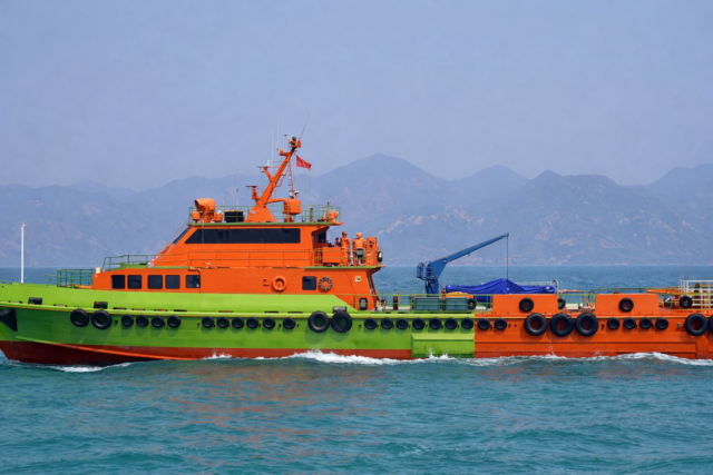 Deck equipment includes an anchor windlass with 18 mm steel wire rope c/w thimble eye, anchor chain and winch, enhancing anchoring capabilities. Accommodation is designed to support 60 PAX and 10 crew, providing comfort and safety for offshore missions. Life-saving systems comprise 6 x 25-man SOLAS-compliant rafts, while external fire-fighting equipment includes a Fi-Fi 1/4 system with 600 m³/hr, 130 m head pumps, and internal fire-fighting is supported by an emergency pump (85 l/min @ 23 m head), a fixed CO2 system, and optical multi-sensor fire detection and alarm. This vessel is well-suited for crew transport, offshore support, and multi-purpose service operations, combining high speed, maneuverability, and robust safety and operational systems in a compact and versatile platform.
